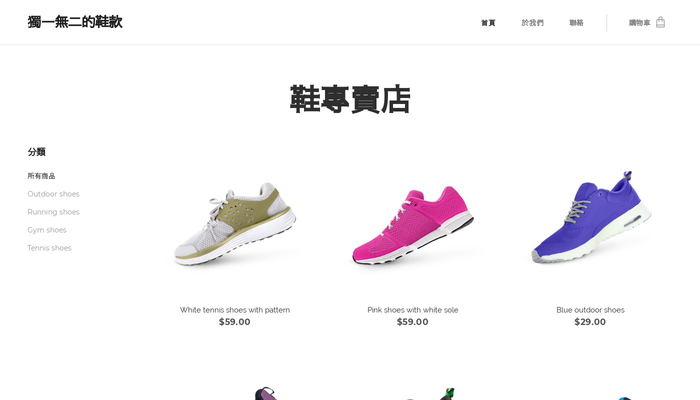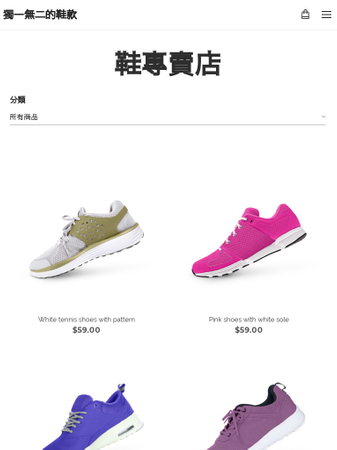 利用這個嶄新的模板來創建一個網路鞋店吧。輕鬆分類您的商品、新增敘述,簡單幾步驟就能馬上開始銷售。