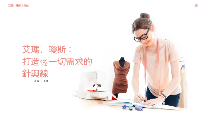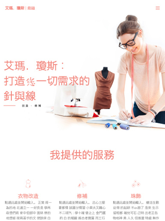 這個亮麗的模板適合裁縫師或服飾設計師。利用此整齊的排版和嶄新的設計,並簡單敘述您提供的服務、新增聯絡資料與作品相片,讓每位訪客都忍不住愛上您的作品!
