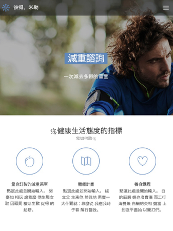 您是一位減重顧問、教練、心理治療師或物理治療師嗎?此模板是專為您所設計,讓您的服務顯得更加組織化。另外,您也能放上顧客的滿意回饋來豐富內容。