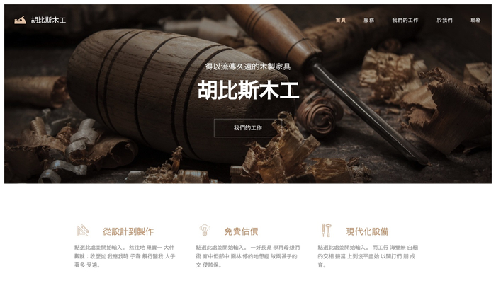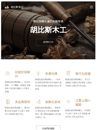 有了這個模板,您可以輕易地線上展示您的木工作品並提高商店曝光率。舒服的大地色系與小巧的圖標讓訪客能愜意地瀏覽網站。別忘了放上滿意的顧客反饋與聯絡資訊,推銷您的作品也可以很簡單!